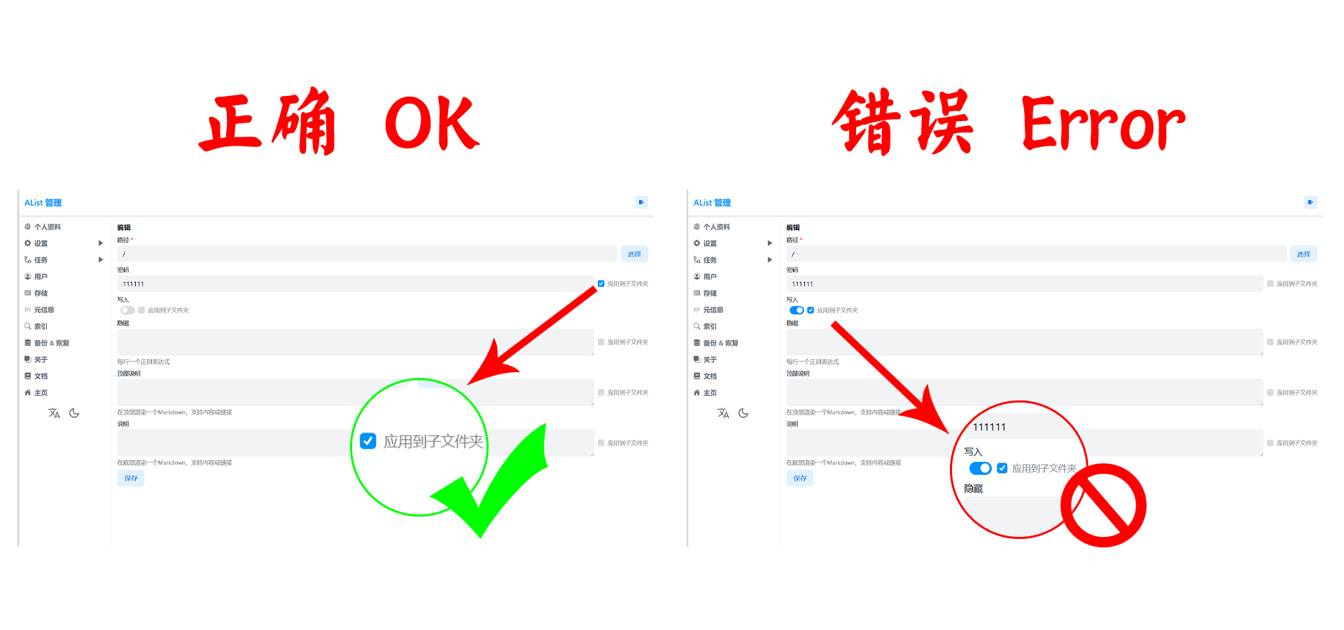 ❌ You cannot directly fill in the meta information of the root directory /, and then fill in the folder we want to hide, the error case View details